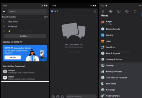 Google以9比5共享了一些截图,显示了Facebook Android应用的稳定版暗模式的外观。我们之前已经看过一些版本,但是据报道这将是最终推出的版本。它使用深灰色和几乎黑色的阴影,并显示在设置,帖子和家庭供稿中。切换模式时,您会看到Facebook的蓝色配色和白色。