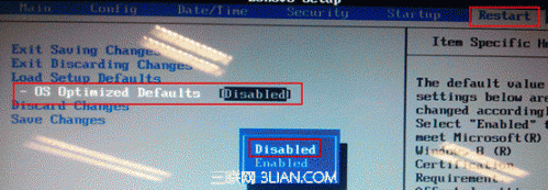 1. 开机F1进入BIOS,选择“Restart”-“OS Optimized Defaults”如下图: