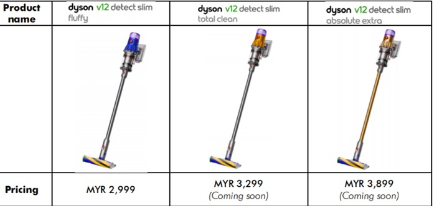 Dyson V12 Detect Slim 现已在 www.dyson.my、The Gardens Mall 和 Mid Valley Southkey 的 Dyson Demo 商店以及 Dyson Service Center & Store – TTDI 有售 。顺便说一句,Dyson V12 Detect Slim Slim Fluffy 是在马来西亚销售的第一个变种,而 Total Clean 和 Absolute Extra 将在稍后推出,售价分别为 RM3299 和 RM3899。