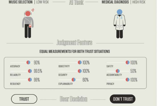 例如,一个因素是准确性。音乐选择算法可能不需要过于精确,特别是如果一个人好奇地有时会跳出自己的口味来体验新颖性时,在任何情况下,跳到下一首歌曲都是很容易的。信任仅能进行癌症诊断的准确率达到90%的AI会是完全不同的事情,这是一项风险很大的任务。