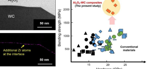 值得注意的是,研究人员通过相对适度地添加ZrO2实现了这些显着的弯曲强度改进。添加剂占成品Al 2 O 3 -WC CMC的质量的不到5%,这小于添加剂增强的CMC中通常存在的添加剂的量。当研究人员使用一种称为原子分辨率扫描透射电子显微镜的方法研究其超硬ZrO2增强的Al 2 O 3 -WC CMC的结构时,他们发现Zr原子位于Al 2 O 3和Al 2 O 3薄板之间的薄层中。厕所。关于Al 2 O 3之间的界面Nishi博士和Matsunaga博士指出,“ WC薄板在机械性能方面通常是薄弱点。” 因此,片之间的界面是Zr原子发挥增强Al 2 O 3 -WC CMC效果的合理位置。确实,当研究人员使用数学物理学领域的一种称为密度泛函理论的技术对Zr原子的效应进行建模时,他们的结果表明Zr原子的界面层将增强其CMC的稳定性。