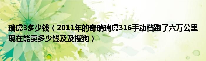 大家好,小常来为大家解答以下问题,对于瑞虎3多少钱,2011年的奇瑞瑞虎316手动档跑了六万公里现在能卖多少钱及及搜狗很多人还不知道,今天让我们一起来看看吧!