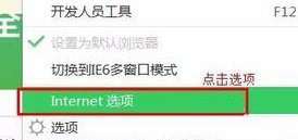 1、运行浏览器,在窗口上方单击“工具”选项,接在如下图所示的下拉菜单中选择“Internet选项”一栏。