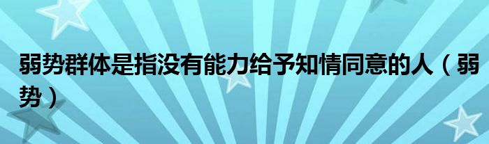关于弱势群体是指没有能力给予知情同意的人,弱势这个很多人还不知道,今天菲菲来为大家解答以上的问题,现在让我们一起来看看吧!